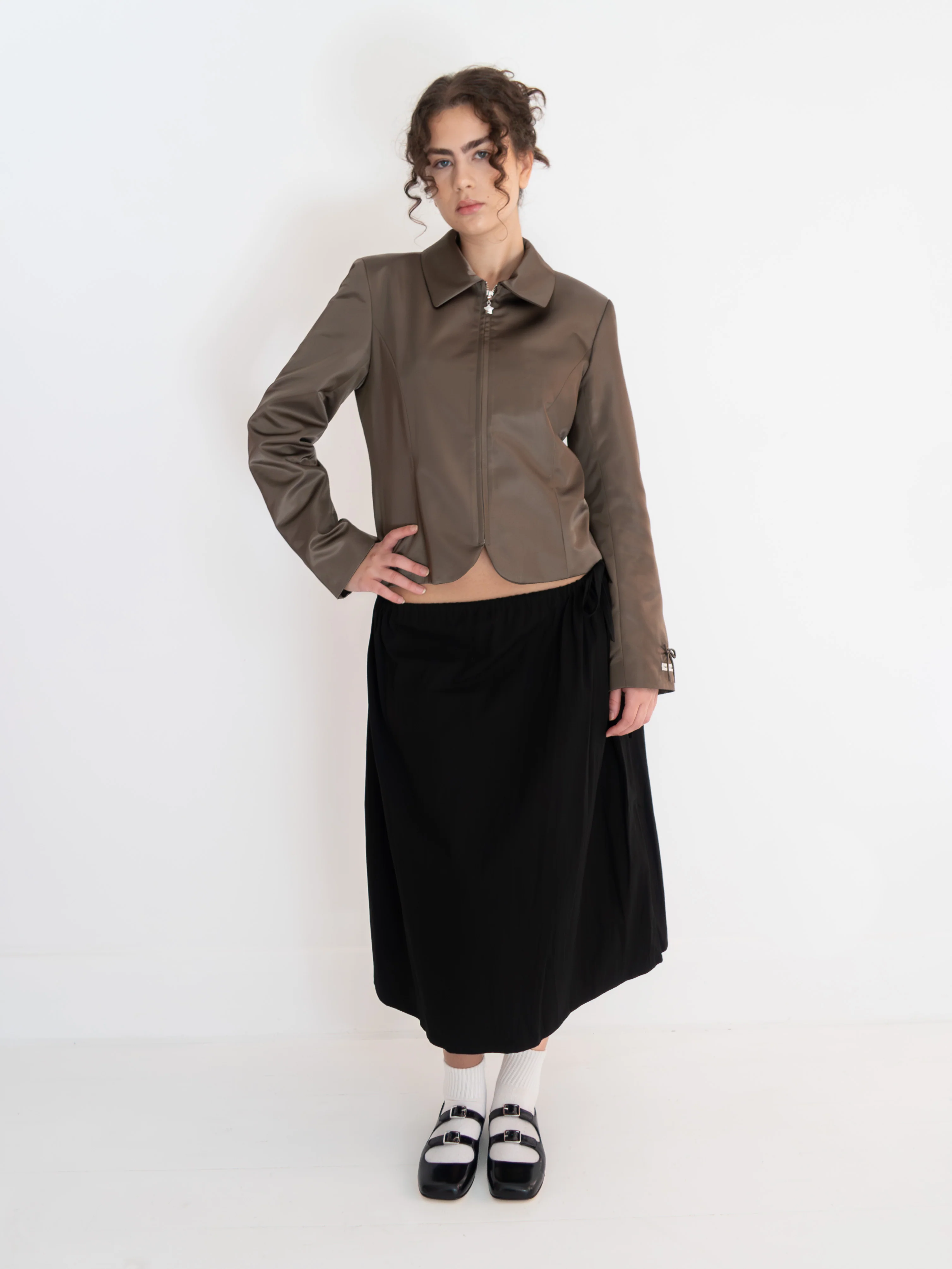 A sweet, tailored satin jacket in a glossy olive colour. Seams contour along the body to create a flattering fitted shape with a curved hem detail at the front. A shining silver star decorates the zipper tab and a logo and bow complete the left cuff. Fully lined in smooth viscose.