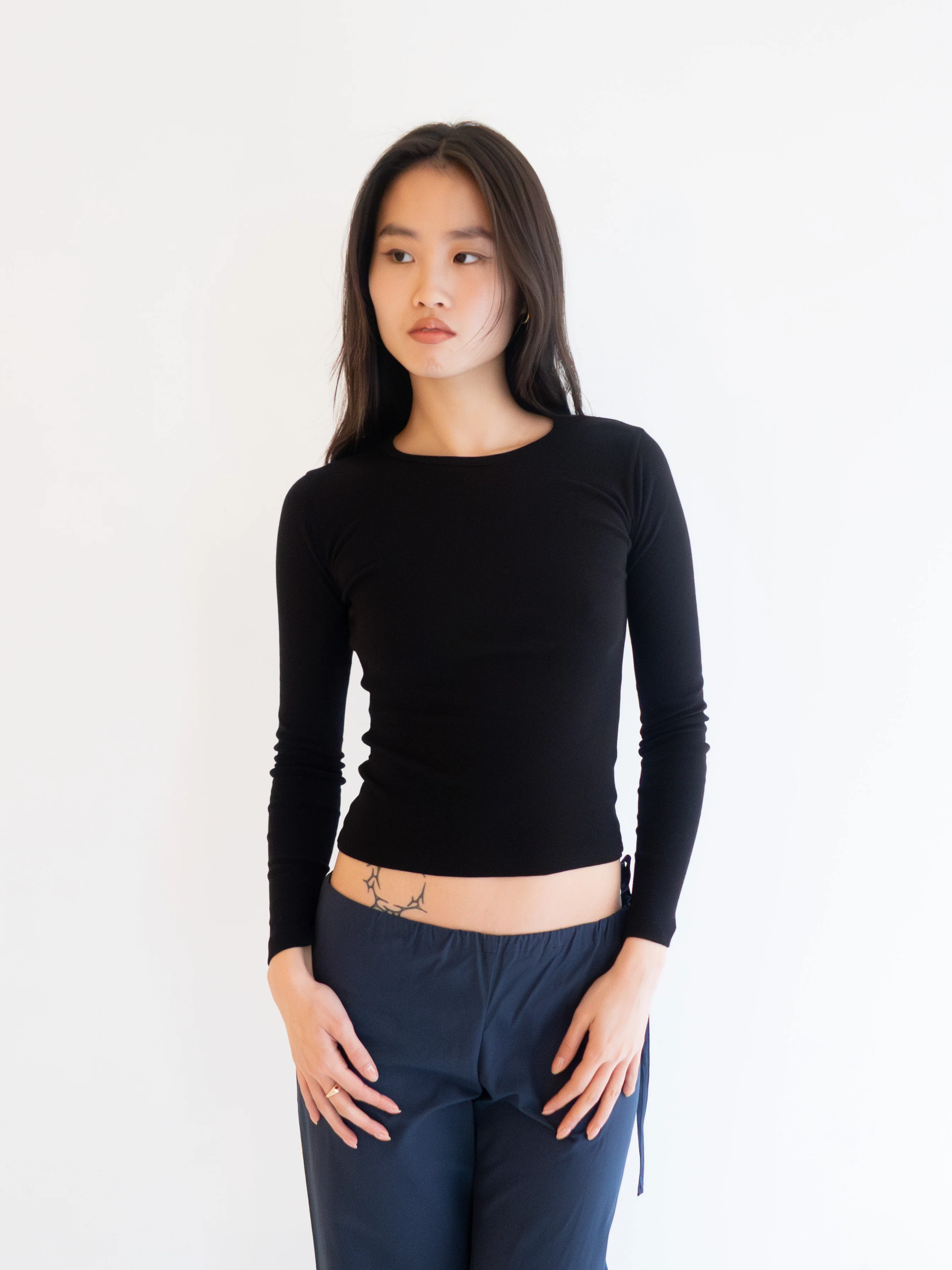 An ultra soft, cotton rib long sleeve. Fitted to perfection with a round neckline, it's the perfect base layer. This top is a true black and has enough length to tuck into a waistband or rest nicely on the hip.