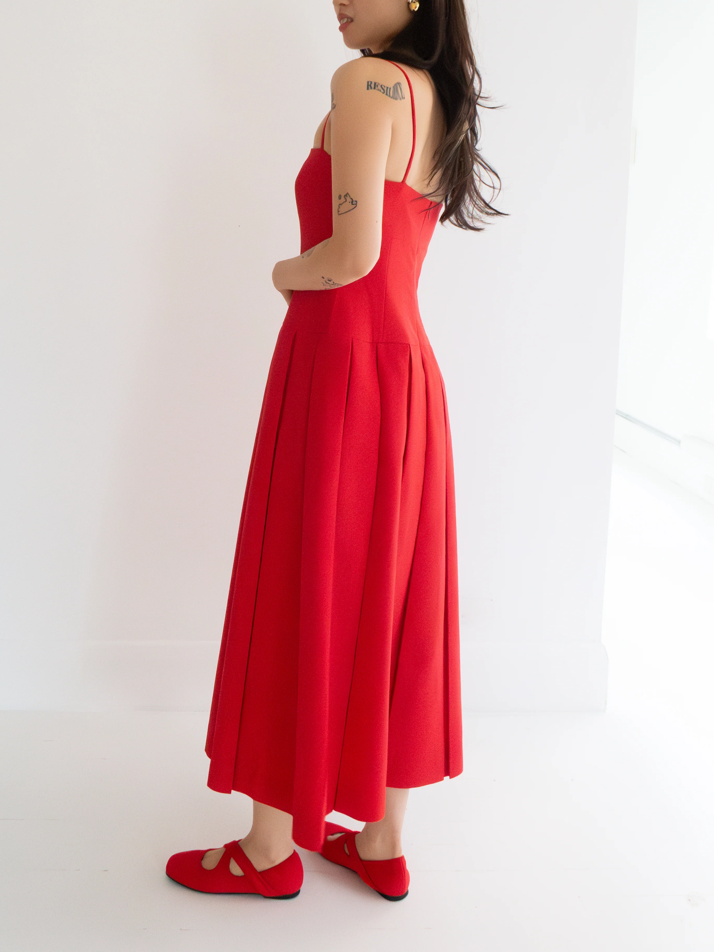 A striking red dress with sharp pleats that fall from the waist. The slightly structured bodice has a clean, straight neckline and thin straps. Fully lined, the back features a concealed zip with hook closure.