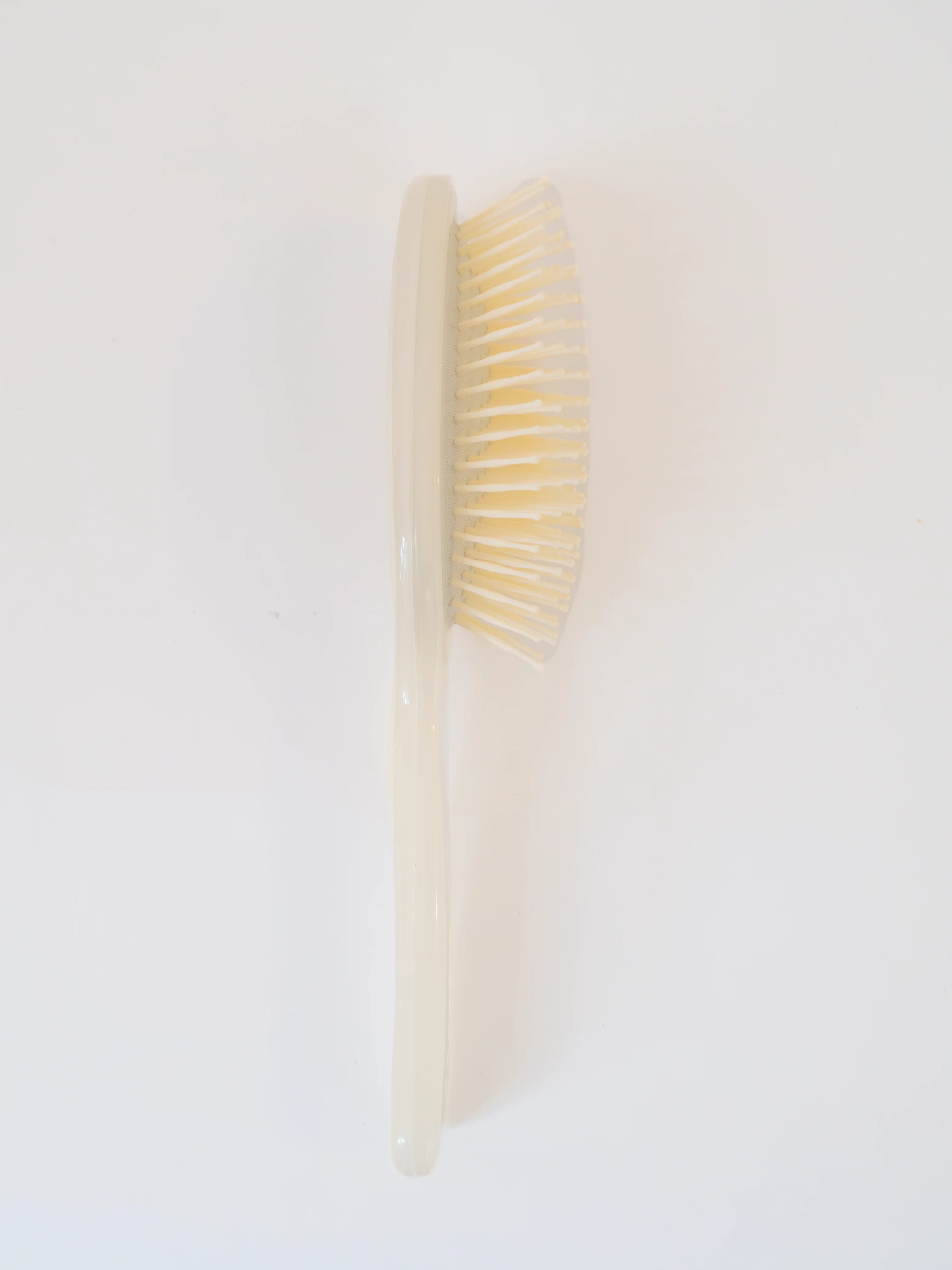 This oval brush is made from Bioacetate, a plant-based biodegradable, and recyclable material. Its natural rubber cushion holds extra-long pins, perfect for detangling and scalp massage. Suitable for all hair types, it works well on wet or dry hair.