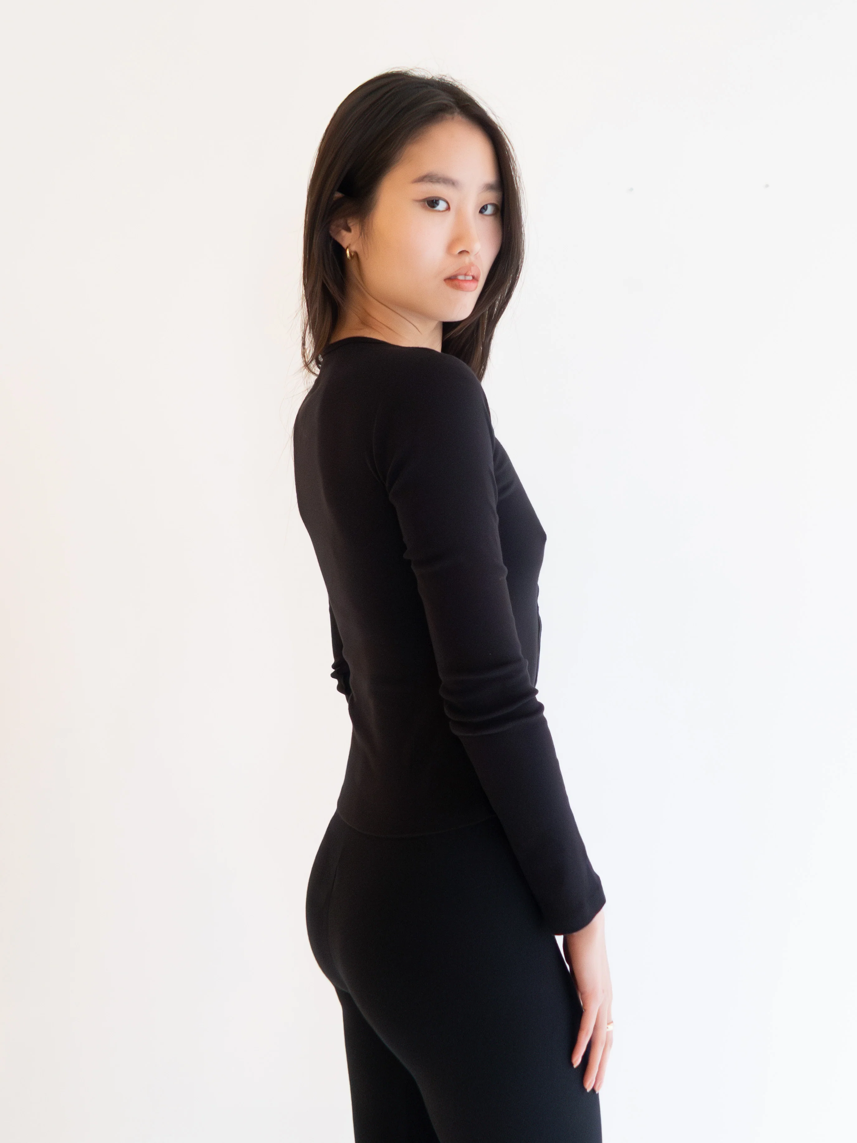 An ultra soft cardigan made from cotton rib, with tonal buttons down the front and a scooped neckline. Undo the top buttons for a sexier, deeper neckline or undo the bottom for midriff to peek through. This is a great piece for layering, for travel and casual wear.